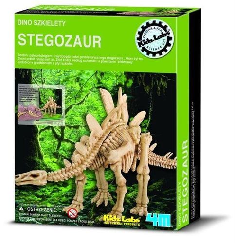 Zestaw zawiera bryłę gipsu w której ukryte są kości dinozaura oraz narzędzia do prowadzenia wykopalisk. Po odnalezieniu i oczyszczeniu wszystkich kości można z nich złożyć cały szkielet. Gotowy szkielet ma około17 centymetrów długości. Dołączona do zestawu kartonowa karta ekspozycyjnazawiera wiele ciekawych informacji na tematStegosaurusa na odwrocie.