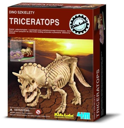 Zajrzyj do środka - znajdziesz tam więcej ciekawych faktów. BAW SIĘ I UCZ JEDNOCZEŚNIE!ZAWARTOŚĆ:Zestaw zawiera bryłę gipsu w której ukryte są kości dinozaura oraz narzędzia do prowadzenia wykopalisk. Po odnalezieniu i oczyszczeniu wszystkich kości można z nich złożyć cały szkielet. Gotowy szkielet ma około20 cm długości. Dołączona do zestawu kartonowa karta ekspozycyjna zawierawiele ciekawych informacji na tematTriceratopsa na odwrocie.