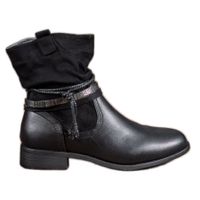 Modne i wygodne botki damskie w kolorze czarnym. Buty wyprodukowano ze skóry ekologicznej najwyższej jakości. Odpowiednio wyprofilowana podeszwa zapewnia wygodę i stabilność w trakcie chodzenia. Srebrne elementy ozdobne nadają całości charakteru. Botki spodobają się każdej kobiecie, która nie boi się eksperymentować z modą.