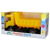 Super wywrotka Giants Dump Truck dwuosiowa w kolorze żółtoczarnym z żółtą naczepą. Wykonana z wysokiej jakości materiałów, spełniających normy Europejskie. Pojazd posiada blokadę naczepy, dzięki czemu dziecko może bezpiecznie na nim siadać. Ta funkcjonalna wywrotka ma 62 cm długości i wytrzymuje obciążenie do 150 kg.