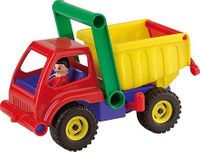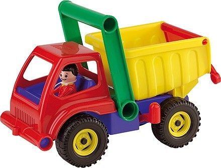 Kolorowa wywrotka o długości 27 cm, wykonana z elestycznego plastiku wysokiej jakości, spełniającego normy europejskie. Funkcjonalne autko, wagonik można przechylić aby wysypać np. piasek.