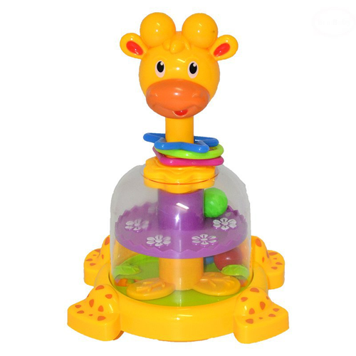 Po naciśnięciu głowy żyrafy zaczynają się kręcić elementy podbijając piłeczki które znajdują się w środku zabawki