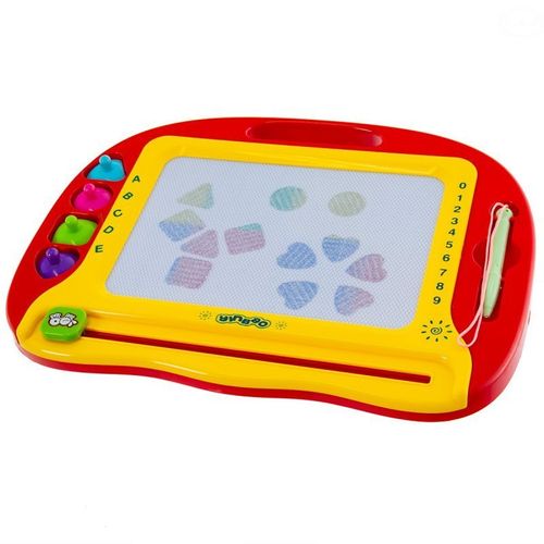 Zabawka tablica do rysowaniaZabawka tablica do rysowaniaDuża tablica do rysowania znikopis. Na panelu możemy tworzyć dowolne rysunki za pomocą magnetycznego długopisu. W każdej chwili możemy wymazać rysunek posługując się suwakiem w dolnej części tablicy. Do zabawki dołączone są 4 pieczątki magnetyczne. Wszystkie elementy służące do rysowania można umieszczać w specjalnych uchwytach na tablicy. Panel do rysowania podzielony jest na 8 stref kolorystycznych.