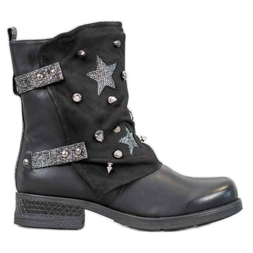 Wygodne i modne workery w kolorze czarnym. Buty wykonano przy użyciu skóry ekologicznej świetnej jakości. Dzięki wysokim cholewkom obuwie świetnie chroni stopy przed niekorzystnymi warunkami pogodowymi. Warto też zwrócić uwagę na srebrne elementy ozdobne umieszczone na butach. To właśnie dzięki nim buty wyglądają oryginalnie i modnie.