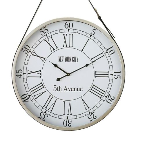 Okrągły zegar ścienny do powieszenia na pasku. Całość nawiązuje swoim wyglądem do stylistyki nowojorskiej, którą podkreśla elegancki skóropodobny uchwyt oraz designerska tarcza z arabskimi i rzymskimi cyframi. Idealnie sprawdzi się jako dekoracja i stylowy, urzekający swoim oryginalnym wyglądem dodatek do wnętrz. Pasuje do pomieszczeń o różnym przeznaczeniu, doskonale nadaje się także na prezent. Rama wykonana została z metalu. Zegar z pewnością przypadnie do gustu miłośnikom różnych stylów i dostarczy wielu pomysłów na ciekawe aranżacje.
