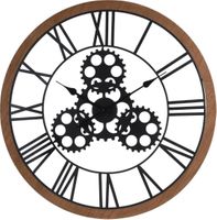 Skromna i pełna gracji tarcza jest niezwykle czytelna i bardzo okazale prezentuje się na ścianach pomieszczeń w klimacie industrialnym, a także nowoczesnym. Funkcjonalna, praktyczna ozdoba, która harmonijnie dopełni aranżację. Zegar został zrobiony z drewnianej okrągłej ramy oraz metalowych elementów. Pośrodku tarczy ozdobne tryby zostały umieszczone symetrycznie. Wysokość: 70