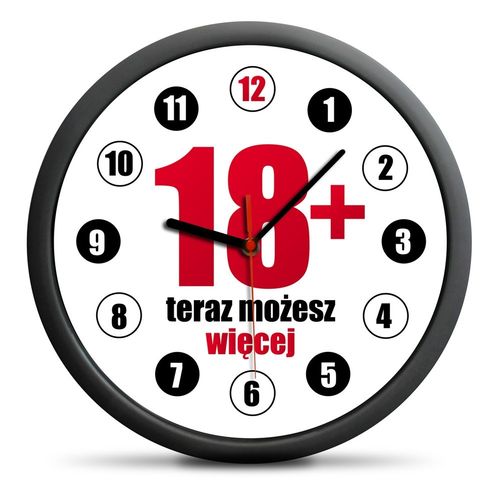 Zegar ścienny z oznaczeniem 18+ oraz mottem.Osiemnaste urodziny to początek nowego, zupełnie dorosłego życia. Istnieje przekonanie, że właśnie od tego momentu można pozwolić sobie na znacznie więcej, a czas biegnie inaczej, zabawniej, a przede wszystkim szybciej. Jaki prezent zaakcentuje lepiej ten moment w życiu niż symbol upływu czasu, jakim jest zegar? Oczywiście nie jakiś zwyczajny i nudny, ale specjalny zegar na 18-stkę! Ten zegar to doskonały pomysł na osiemnastkowy prezent. Skutecznie przypomni jubilatowi o przywilejach dorosłego życia. Zegar na 18 urodziny dozwolony jest od 18 lat i zdobi go słuszne motto, które uszczęśliwi każdego człowieka wchodzącego w dorosłość: „Teraz możesz więcej!”. Gadżet w pigułce: - motto: "Teraz możesz więcej!"- średnica: 30 cm- obudowa pokryta gumowaną powłoką- tarcza chroniona przez szklaną szybę- praktyczny i zabawny gadżet na 18 urodziny
