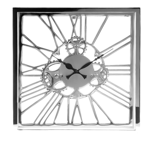 Zegar ścienny Pendulum w kwadratowej ramce o szerokości 36cm. Niklowany zegar ścienny wyróżnia oryginalna oprawa. Sama tarcza zegara wyróżnia się oryginalnymi, dużymi cyframi rzymskimi, które łączą się ze środkiem, tworząc wyjątkową kompozycję. Wskazówki zegara w czarnym kolorze uzupełniają całość w elegancki sposób. Zegar Pendulum może zdobić każdy kąt domu w stylu Metropolitan.