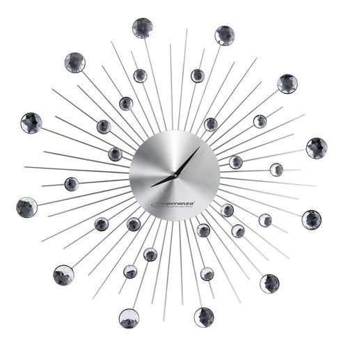 Informacje dodatkowe: Średnica całego zegara 50cm Średnica tarczy 13,5cm Długość ozdobnych "promieni" 35,5cm Grubość zegara 2,5cm Tarcza zegara oraz wskazówki wykonane z aluminium Ozdobne "promienie" wykonane ze stali "Kryształki" - w 2 rozmiarach: 2 cm oraz 3cm Zasilanie 1x bateria 1,5V AA (brak w zestawie) Opis ogólny: Zegar ścienny Esperanza "Chicago"