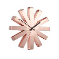 Nowoczesny zegar posiadający nietypową i efektowną formę. Jego oryginalny design sprawia, że będzie pasował do wnętrz w stylu industrialnym. Promieniście rozchodzące się na polu koła pasy, wskazujące konkretną godzinę, z powodzeniem zastępują tradycyjną tarczę zegarową. Materiał z jakiego wykonano zegar sprawia, że wydaje się on dość masywny, jednakże sposób zagięcia stalowych pasów i ich symetria względem środka tarczy zdecydowanie dodaje mu lekkości. Zegar nie posiada cyfr, a jedynym nadrukiem jest delikatne logo marki. Czarne wskazówki doskonale kontrastują z pasami o miedzianym kolorze, dlatego są bardzo dobrze widoczne z większej odległości. Ten niepowtarzalny zegar z pewnością przykuje wzrok każdego gościa.