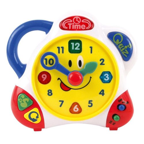 Wesoły dwujęzyczny (angielski/polski) zegar, który poprzez zabawę pomoże Maluszkowi w nauce cyfr, godzin i rozpoznawania kształtów. Kiedy dziecko zacznie przesuwać wskazówi, usłyszy ustawioną przez siebie godzinę. Po przełączeniu na Quiz Maluszek będzie miał za zadanie wskazać odpowiednią godzinę. Dodatkowo wesołe melodie i świecące przyciski zachęcą dziecko do zabawy. Zegar posiada wygodny do przenoszenia uchwyt, dzięki któremu Maluszek może zabrać go ze sobą wszędzie.UWAGA! W zabawce znajdują się baterie testowe o małej pojemności, co może być przyczyną słabszego działania. Zaleca się wymianę na nowe, alkaliczne. Jeżeli zabawka nie funkcjonuje prawidłowo, należy wyłączyć zabawkę i włączyć ponownie. Jeśli problem nie ustąpi należy wymienić baterie na nowe.UWAGA! Baterie zawarte w zabawce są także przeznaczone do demonstracji w sklepie. Może się zdarzyć, że baterie się wyczerpią przed zakupem przez klienta i klient będzie musiał wymienić zawarte baterie na nowe w celu uzyskania poprawnego działania zabawki.