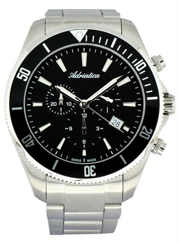 Chronograf Adriatica, masywna stalowa koperta z obrotowym pierścieniem. Szafirowym szkiełkiem. Wskazówki i indeksy pokryte substancją iluminującą. Datownik na godz. 4. Bransoleta zwalniana przyciskami z dodatkowym zabezpieczeniem. Dekiel zakręcany.Klasa szczelności 50M
