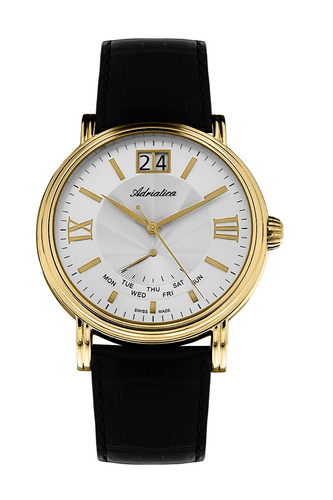 Męski zegarek A8237.1263Q marki Adriatica wyposażony w szwajcarski mechanizm kwarcowy Ronda 7003. Koperta wykonana ze stali szlachetnej została ozdobiona powłoką naniesioną metodą PVD kolorze złotym. Zegarek wyposażony w rozbudowany datownik wskazując dzień m-ca na godz. 12 a u dołu na dodatkowej pół tarczy nazwę dnia tygodnia. Dekiel zakręcany. Model wykonano ...Męski zegarek A8237.1263Q marki Adriatica wyposażony w szwajcarski mechanizm kwarcowy Ronda 7003. Koperta wykonana ze stali szlachetnej została ozdobiona powłoką naniesioną metodą PVD kolorze złotym. Zegarek wyposażony w rozbudowany datownik wskazując dzień m-ca na godz. 12 a u dołu na dodatkowej pół tarczy nazwę dnia tygodnia. Dekiel zakręcany. Model wykonano w klasie szczelności 5 ATM wyposażono w mineralne szkło. szerokość koperty 43 mm, grubość koperty 12 mm, waga 88,55 g
