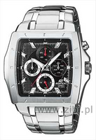 Niezwykle okazały model Casio z rozbudowanym datownikiem wskazującym dzień m-ca, tygodnia i nazwę m-ca. Stalowa koperta i bransoleta, atrakcyjnie wyglądające sferyczne szkiełko. Model z mechanizmem kwarcowym. Klasa szczelności 100M