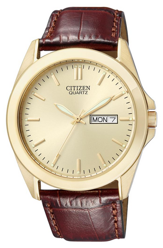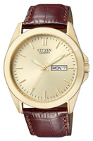 Męski, elegancki zegarek BF0582-01PE marki Citizen wyposażony w japoński mechanizm kwarcowy z datownikiem. Koperta wykonana ze stali szlachetnej pokryta została złotą powłoką. Tarcza, indeksy i wskazówki również koloru złotego. Dodatkowo wskazówki wypełnione zostały substancją iluminującą czyniąc ten zegarek bardzo czytelnym. Model wykonano w klasie szczelno...Męski, elegancki zegarek BF0582-01PE marki Citizen wyposażony w japoński mechanizm kwarcowy z datownikiem. Koperta wykonana ze stali szlachetnej pokryta została złotą powłoką. Tarcza, indeksy i wskazówki również koloru złotego. Dodatkowo wskazówki wypełnione zostały substancją iluminującą czyniąc ten zegarek bardzo czytelnym. Model wykonano w klasie szczelności 3 ATM oraz wyposażono w mineralne utwardzane szkło. Całość opina brązowy skórzany pasek. szerokość koperty 41 mm, grubość koperty 9 mm, waga 54 g