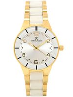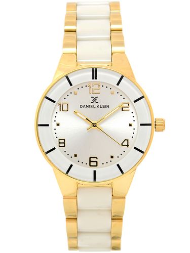 Opis zegarka: Zegarek damski Daniel Klein z serii Exclusive. Mechanizm: Ten zegarek odmierza czas dzięki zamontowanemu wewnątrz mechanizmowi kwarcowemu zasilanemu za pomocą impulsu elektrycznego z baterii. Bransoletka:Stalowa z elementami tworzywa sztucznego. Koperta: Stalowa pokryta powłoką IPG. Szkiełko: Szkiełko mineralne. Wodoszczelność: Water Resist 3 BAR (30M) zegarek uszczelniony, odporny na zachlapanie. Instrukcja:Do zegarka dołączona jest instrukcja w języku polskim. Gwarancja:Wszystkie sprzedawane przez nas zegarki są nowe. Gwarancja wystawiana jest przez nasz sklep tuż przed spakowaniem przesyłki, gwarancja jest pisemna na okres 24 miesięcy, do każdego zakupu załączony paragon lub na życzenie klienta faktura Vat. Kolorystyka: Tarcza: kolor srebrny. Wskazówki: kolor złoty. Koperta: kolor złoty. Bransoletka: kolor złoty. Wymiary: - koperta : szerokość 34 mm, wysokość 41 mm - tarcza : średnica 32,5 mm - szerokość bransolety: 18 mm - grubość zegarka: 8,5 mm - obwód zegarka do 18 cm Do zegarka firmowe pudełko w komplecie: