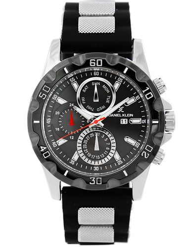 Opis zegarka: Zegarek męski Daniel Klein z serii Prestige. Mechanizm: Ten zegarek odmierza czas dzięki zamontowanemu wewnątrz mechanizmowi kwarcowemu zasilanemu za pomocą impulsu elektrycznego z baterii. Pasek:Pasek wykonany z wysokiej jakości elastycznego tworzywa sztucznego. Koperta: Stalowa pokryta powłoką IPS/IPB. Szkiełko: Szkiełko mineralne. Wodoszczelność: Water Resist 3 BAR (30M) zegarek uszczelniony, odporny na zachlapanie. Datownik: Kalendarz pokazuje aktualny dzień miesiąca.Dodatkowe dekoracyjne ozdobne tarcze i wskazówki: nieruchome imitacje wskazań chronografu. Instrukcja:Do zegarka dołączona jest instrukcja w języku polskim. Gwarancja:Wszystkie sprzedawane przez nas zegarki są nowe. Gwarancja wystawiana jest przez nasz sklep tuż przed spakowaniem przesyłki, gwarancja jest pisemna na okres 24 miesięcy, do każdego zakupu załączony paragon lub na życzenie klienta faktura Vat. Kolorystyka:Tarcza: kolor czarny. Wskazówki: kolor srebrny. Koperta: kolor srebrny + czarny pierścień. Pasek: kolor czarny. Wymiary: - koperta : szerokość 46 mm, wysokość 54,5 mm - tarcza : średnica 36 mm - szerokość bransolety: 24 mm - grubość zegarka: 12 mm - obwód zegarka do 22 cm Do zegarka firmowe pudełko w komplecie: