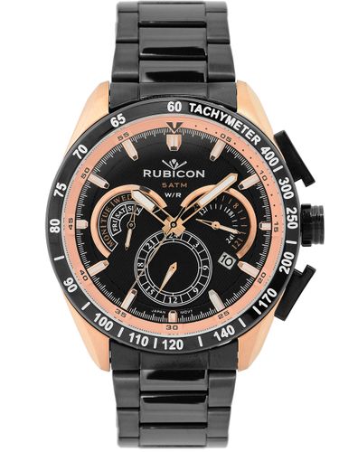 Opis zegarka: Mechanizm: Ten zegarek odmierza czas dzięki zamontowanemu wewnątrz mechanizmowi kwarcowemu zasilanemu za pomocą impulsu elektrycznego z baterii. Pasek:Stalowy pokryty powłoką IPS/IPB. Koperta: Stalowa pokryta powłoką IPS/IPB. Szkiełko: Szkiełko mineralne. Wodoszczelność: Water Resist 5 BAR (50M) zegarek uszczelniony, odporny na zachlapanie. Datownik: Kalendarz pokazuje:- okienko przy godzinie 4-tej: aktualny dzień miesiąca - lewa tarcza : aktualny dzień tygodnia.Dodatkowe:Wskazanie 24-godzinne - prawa tarcza. Dual Time - możliwość ustawienia drugiej godziny na dolnej tarczy. Instrukcja:Do zegarka dołączona jest instrukcja w języku polskim. Gwarancja:Wszystkie sprzedawane przez nas zegarki są nowe. Gwarancja wystawiana jest przez nasz sklep tuż przed spakowaniem przesyłki, gwarancja jest pisemna na okres 24 miesięcy, do każdego zakupu załączony paragon lub na życzenie klienta faktura Vat. Kolorystyka:Tarcza: kolor czarny. Wskazówki: kolor srebrny. Koperta: kolor miedziany + czarny pierścień. Bransoleta: kolor czarny. Wymiary: - koperta : szerokość 44 mm, wysokość 50 mm - szkiełko: średnica 37 mm - szerokość bransolety: 22 mm - grubość zegarka: 12 mm - obwód zegarka do 21,5 cm Możliwość skrócenia przez usunięcie ogniw. Zegarek jest zapakowany w oryginalne pudełko RUBICON