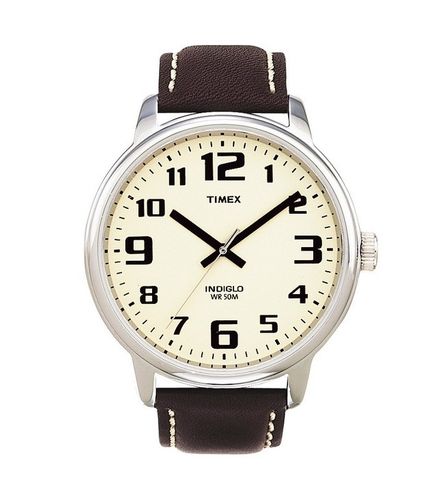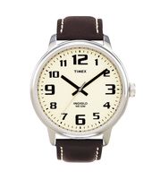 Zegarek Timex z kolekcji Easy Reader niezwykle wyraźny, czytelny z podświetleniem tarczy INDIGLO. Koperta w kolorze stalowym, pasek ciemnobrązowy z jaśniejszym przeszyciem.