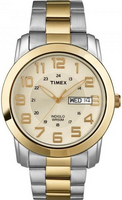 ...Męski zegarek Timex w dwukolorowej wersji, duże czytelne cyfry w kolorze złotym i rozszerzony kalendarz. Podświetlenie Indiglo.
