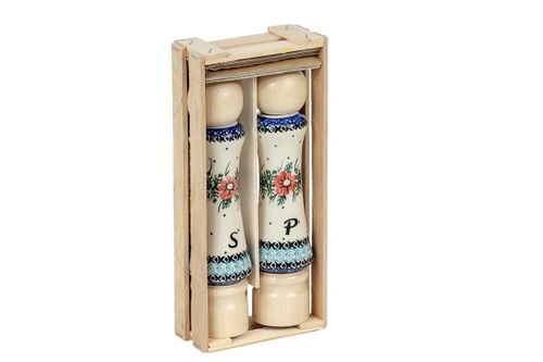 Zestaw dwóch ozdobnych, ręcznych młynków do pieprzu i soli. Korpusy wykonane ze stylowej ceramiki z namalowanymi oznaczeniami „P” i „S”.