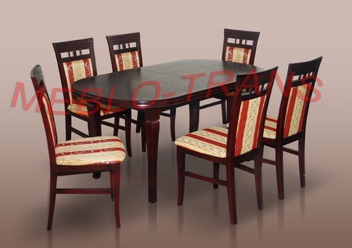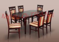 Doskonały zestaw do Twojej jadalni składający się z sześciu krzeseł i rozkładanego stołu w pięknym wybarwieniu drewna.