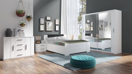 Zestaw składa się z 5 elementów: komody B01, łóżka B02, dwóch stolików nocnych B03 oraz szafy B05.