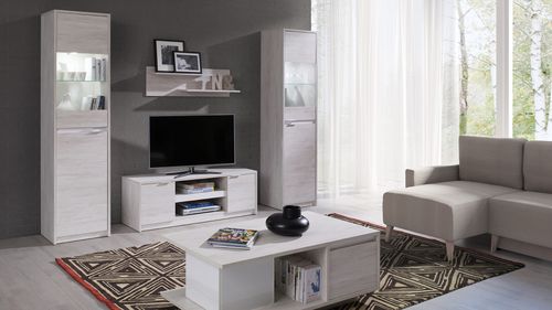 Zestaw składa się z 4 elementów: półki D07, szafki RTV D10 oraz dwóch witryn D16.