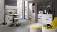 Zestaw składa się z 4 elementów: biurka D01, komody D02, regału D08 oraz szafki D12.