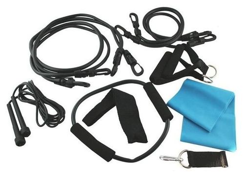 Zestaw do ćwiczeń firmy Hms. Składa się z czterech gum oporowych, jednej gumy elastycznej, jednej opaski oporowej, dwóch piankowych uchwytów na ręce, jednego uchwytu na kostkę, jednego uchwytu pod drzwi i skakanki. Każda para linek ma inną sztywność co pozwala wybrać różną intensywność ćwiczeń oporowych. Na każdej z linek może znajdować się uchwyt, który umożliwia realizację kompleksowych ćwiczeń siłowych na wszystkie grupy mięśni.