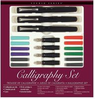 Zestaw do nauki pięknego pisania. Zawiera 4 końcówki do piór o szerokości 1,1 mm 1,5 mm, 1,9 mm i ostrej końcówce które nadadzą odpowiedniego kształtu linii na papierze. W środku znajdują się 3 pióra z chromowanym klipsem oraz 20 wkładów w 6 kolorach: czarnym (6), niebieskim (6), czerwonym (2),zielonym (2), fioletowym (2), turkusowym (2). Do zestawu dołączona jest książeczka z najważńiejszymi informacjami dotyczącymi kaligrafii. Trochę historii i podstawowych informacji dotyczących prawidłowego