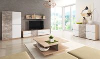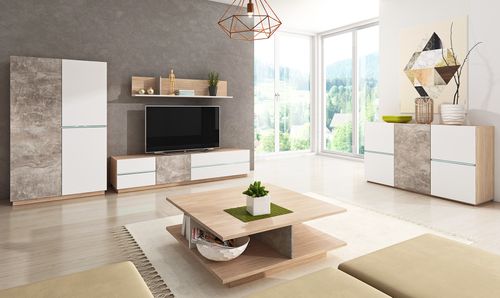 Zestaw składa się z 5 elementów: szafki IN01, półki wiszącej IN02, stolika kawowego IN03 komody IN 05 oraz stolika rtv IN06.