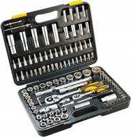 Zestaw kluczy nasadowych składa się ze 108 elementów, uporządkowanych w wygodnej walizce z tworzywa sztucznego.