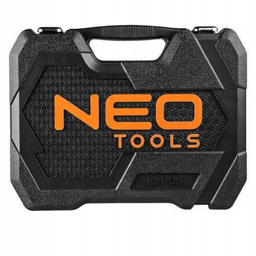 Zestaw kluczy nasadowych 1/2" i 1/4" NEO składa się z 82 elementów, wykonanych z wysokiej jakości stali chromowo-wanadowej. W skład zestawu wchodzą grzechotki 1/2" i 1/4" (trwały mechanizm zapadkowy - 72 zęby) z odgiętymi, ergonomicznymi rękojeściami. Zestaw zawiera bogaty pakiet nasadek sześciokątnych z tłoczonymi napisami (w rozmiarach od 4 do 32 mm) i końcówek wkrętakowych (płaskie, krzyżowe, sześciokątne, Torx). Dodatkowo w walizce umieszczono klucze płasko-oczkowe (9 sztuk, 8mm - 22mm). Uzupełnieniem całości jest szeroki pakiet akcesoriów. Wertykalne umieszczenie elementów w walizce umożliwia szybsze skompletowanie niezbędnego zestawu. Klucze są dostarczane w praktycznej i solidnej walizce z tworzywa sztucznego z metalowymi zatrzaskami i poręcznym uchwytem. Niezawodność produktu potwierdza 25-letnia gwarancja oraz certyfikat TÜV Rheinland M+T.
