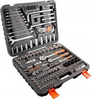 Zestaw kluczy nasadowych 1/4", 1/2", 3/8" składa się z 120 elementów, wykonanych z wysokiej jakości stali chromowo-wanadowej.
