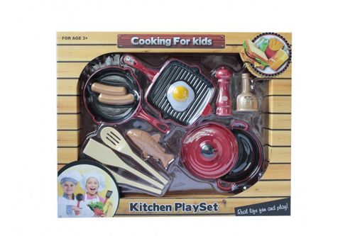 Zestaw zawiera 12 elementów: 2 patelnie, garnek z pokrywką, solniczka, pieprzniczka, jajko sadzone, parówki, rybka, 3 łyżki.