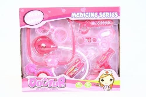 Zestaw lekarski dla dziewczynki. W skład zestawu wchodzą: stetoskop, nożyczki, otoskop, lusterko dentystyczne, szczypce, mikroskop, okulary oraz ciśnieniomierz. Lusterko dentystyczne posiada funkcje świetlne, które po naciśnięciu odpowiedniego przycisku umiejscowionego na rączce, włączają zmienne kolorystycznie światełka. Stetoskop posiada funkcje dźwiękowe oraz świetlne. Po dociśnięciu przyrządu do innej powierzchni słychać imitujące bicie serca odgłosy, którym towarzyszy migające światełko.Akcesoria:- 1xstetoskop-1xlusterko dentystyczne-1xokulary-1xnożyczki-1xszczypce-1xciśnieniomierz-1xmikroskop