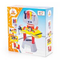 Każdy mały mechanik powinien mieć miejsce, w którym całkowicie będzie mógł się oddać swojej pasji, mniejszym i większym naprawom. Miejsce, gdzie będzie mógł przechowywać swoje narzędzie, w którym nikt nie śmie mu postawić talerza z zupą. Taki jego własny warsztacik. Firma Polesie ma w swojej ofercie zestaw MECHANIK - MAXI 2, który w pełni zaspokoi potrzeby naszego dziecka. Zestaw to nic innego jak duży, stabilny stół z miejscem do pracy i przechowywania niezbędnych narzędzi. Wyposażony jest w dużą półkę umiejscowioną w jego dolnej części, specjalną ściankę z otworami i uchwytami na śrubokręt i klucz francuski oraz imadło. Oprócz tego dołączono do niego komplet akcesoriów: śrubokręt, młotek, kombinerki, klucz francuski, płaskie elementy do skręcania, śrubki i nakrętki. Ogromna liczba naklejek zawartych w zestawie pozwoli na atrakcyjne ozdobienie całego warsztatu. Wszystko wykonane jest z wysokiej jakości plastiku, co gwarantuje trwałość i bezpieczeństwo podczas użytkowania.