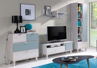 Zestaw składa się z 4 elementów: regału M01, szafki RTV M03, komody M08 oraz półki wiszącej M10.