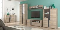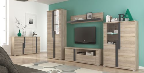 Zestaw składa się z 4 elementów: szafki rtv + półki M01, witryny M02, witryny M03 oraz komody M05.