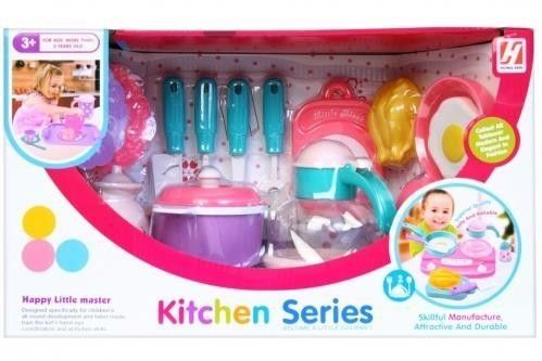 Zestaw naczyń kuchennych oraz akcesoriów, niezbędnych do wyposażenia każdej kuchni. W skład zestawu wchodzi 18 elementów.Akcesoria:1 x garnek2 x przykrywka1 x kuchenka1 x dzbanek na kawę1 x dzbanek na herbatę1 x patelnia1 x deska do krojenia2 x talerz1 x nóż1 x łyżka do makaronu1 x widelec1 x łopatka1 x jajko sadzone1 x kurczak1 x solniczka