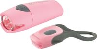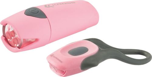 Poręczny zestaw oświetlenia wykonany z tworzywa sztucznego oraz silikonu pozwalającego na szybki montaż. Lampka przednia została wyposażona w 5 diody LED a tylna w 1 diodę LED, gwarantujące wysoką żywotność. Wygodny sposób montażu pozwala stosować oświetlenie w różnych rowerach.