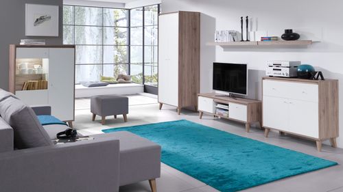 Zestaw składa się z 6 elementów: szafy V02, witryny V03, komody V04, szafki RTV V07, półki wiszącej V09 oraz półki wiszącej V10.