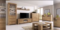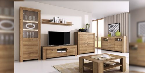 Zestaw składa się z 5 elementów: szafki rtv + półki S01, witryny S02, komody S03, komody S04 oraz ławy S07.