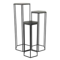 Zestaw stolików heksagonalnych Nesting to bardzo designerskie stoliki. Bardzo wysokie i smukłe stoliki będą noryginalnym kwietnikiem. Stoliki na kwiaty idealnie wpiszą się we wnętrza boho. Dziięki różnym wysokością stolików możemy eksponować na nich rośliny lub inne ciekawe przedmioty. Dzięki ich różnych rozmiarach możemy tworzyc z nich ciekawe kompozycje i aranżacje. Stoliki wyglądają zarówno dobrze zestawione ze sobą w 3, jak i również jako osobne meble. Stoliki zostały zrobione z metalu malowanego na czarno. Wymiary stolików: 1) wysokość 90, szerokość/głębokość 35/30 cm 2) wysokość 74, szerokość/głębokość 31/27 cm 3) wysokość 60, szerokość/głębokość 27/23,5 cm Wysokość: 90
