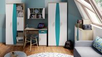 Zestaw składa się z 5 elementów: szafy T02, regału T03, komody T05, biurka T08 oraz półki wiszącej T14.