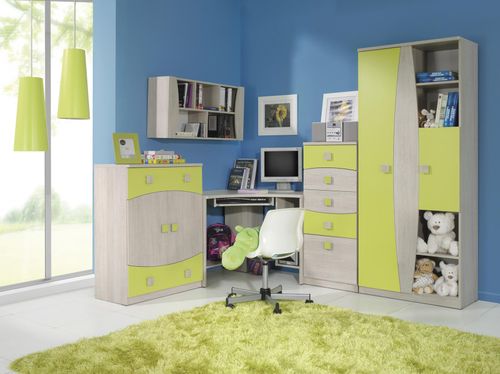 Zestaw składa się z 5 elementów: regału T03, komody T06, komody T07, biurka T12 oraz półki wiszącej T14.