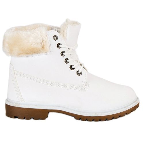 Białe traperki ze skóry ekologicznej, doskonale sprawdzą się jesienią oraz zimą. Ocieplenie oraz wkładka wykonane są z futerka, dzięki czemu buty te skutecznie ochronią przed mrozem. Sznurowanie umożliwia regulację cholewki, natomiast podeszwa z bieżnikiem sprawia, że buty są stabilne i nie ślizgają się.