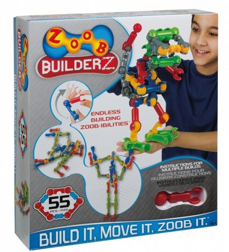 Zestaw klocków Zoob - 55. Zoob to klocki o całkowicie nowatorskim sposobie łączenia. Pięć rodzajów klocków łączy się ze sobą na dwadzieścia różnych sposobów. Można z nich budować pojazdy, dinozaury, zwierzęta, budowle, pierścienie, korale, korony, ludziki itp. Budowa z klocków Zoob pozwala nie tylko na konstruowanie wspaniałych modeli, ale również na twórczą zabawę wszystkim tym, co dziecko stworzyło. Klocki Zoob rozwijają koordynację ręka-oko, precyzyjne umiejętności motoryczne oraz stymulują kreatywność i rozumowanie przestrzenne u dzieci.