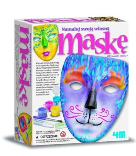 4M Zrób To Sam Maska 3331 Wymyśl i namaluj swoją własną maskę. Dzięki niej możesz być tym kim chcesz! Zmieniaj swoją twarz poprzez dobór kolorów: miła twarz to kolory jasne, a tajemnicza ciemne! Świetna zabawa i rozwój wyobraźni dzieci. Doskonały pomysł na przyjęcia i bale maskowe! ZAWARTOŚĆ:1 plastikowa maska (16 cm długości) pędzelek blisterek z farbami (6 kolorów) UWAGI: ZALECANA JEST POMOC OSOBY DOROSŁEJ. Zabawka dla dziecka: 5 lat + Wymiary opakowania: 30,00 x 21,00 x 10,00 cm Waga (z opakowaniem): 0,30 kg
